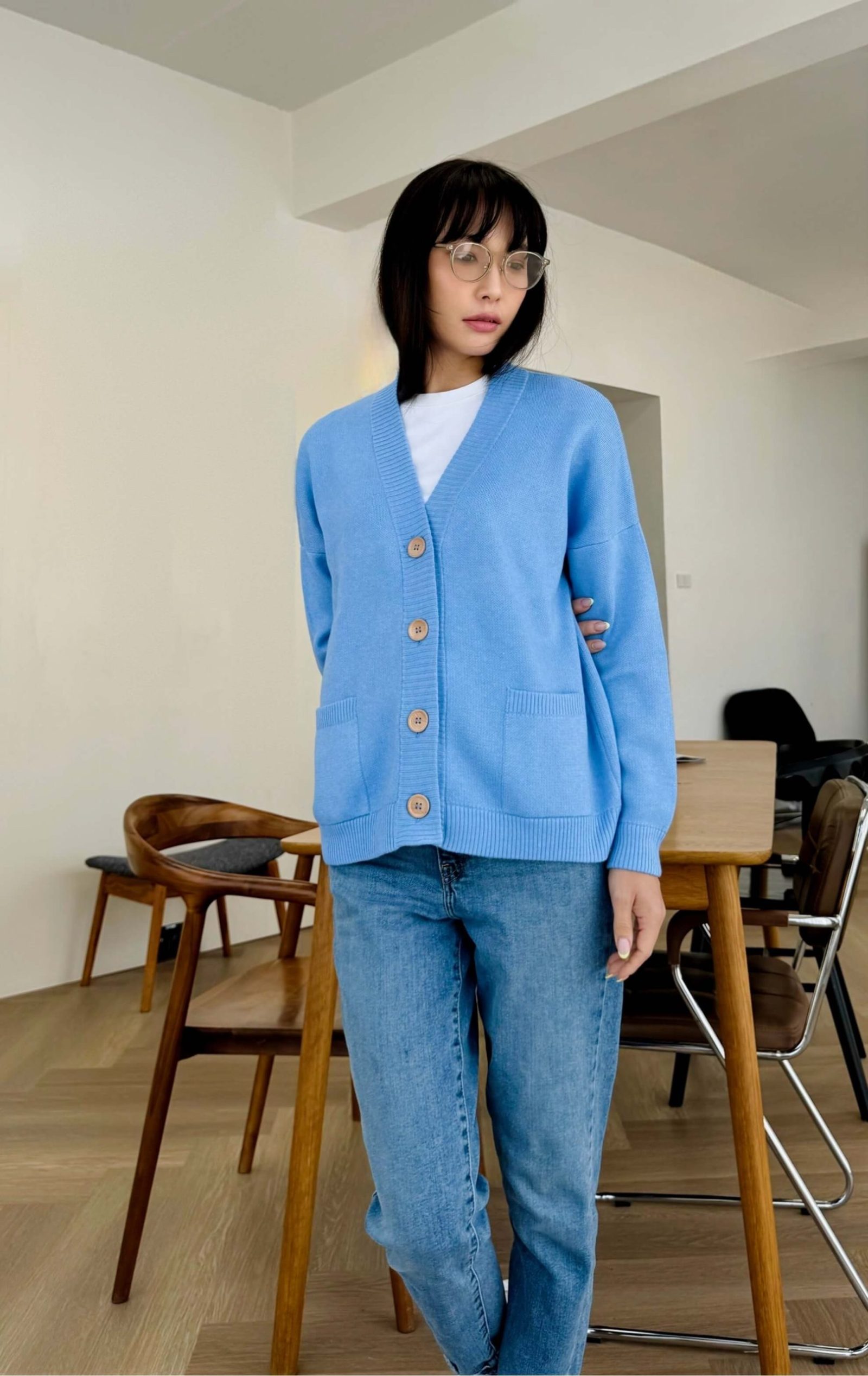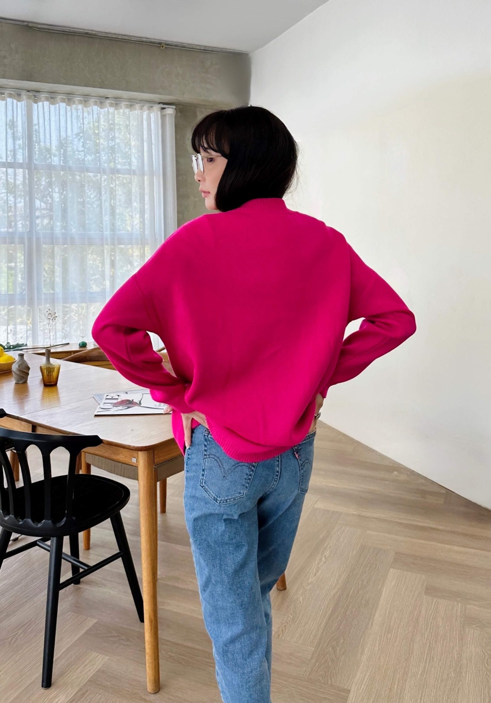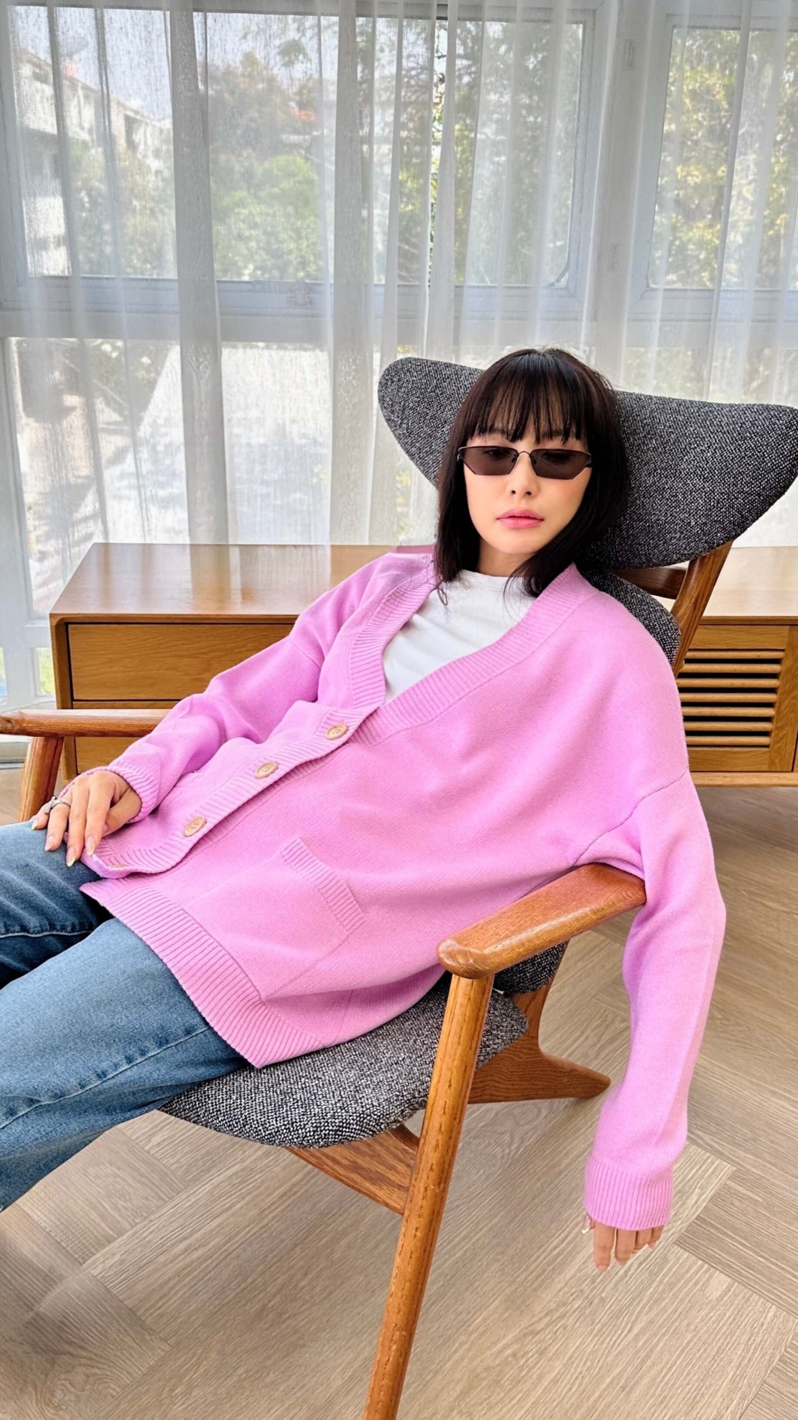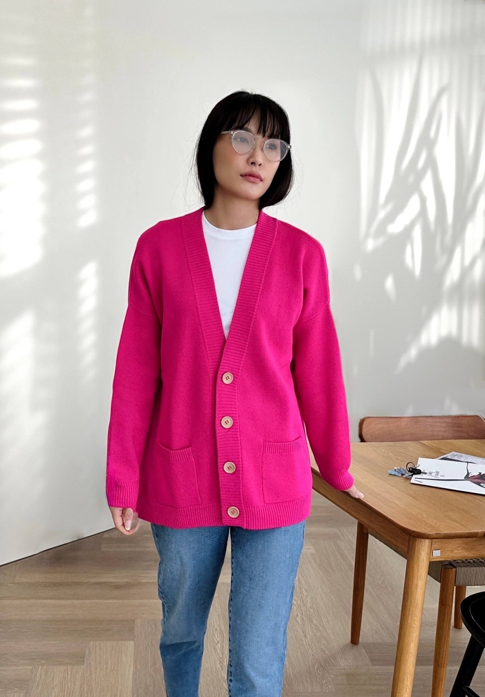 Our oversized wool and acrylic blend cardigan is a wardrobe staple that seamlessly complements any outfit. Its V neckline and wooden buttons add a touch of elegance, while the two pockets offer functionality and flair. Available in classic black, pristine white, azure blue, delicate lilac, and vibrant pink, there’s a hue to suit every mood and occasion. Embrace warmth, luxury, and sustainability with this versatile wardrobe essential. Our locally produced Mongolian wool sweater not only keeps you warm, but it also breathes so you won’t sweat.